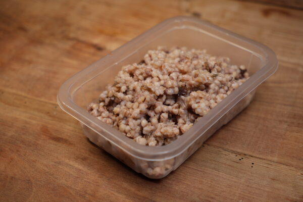 Ingredienti: Brodo vegetale (acqua, carote, cipolle, sale marino iodato), riso carnaroli, salsiccia (9,01%) (carne di suino 100% Italia, sale, pepe, spezie, aromi, destrosio, saccarosio, antiossidanti: E300, regolatori di acidità: E262e E331), radicchio di Treviso, cipolla, olio di semi di girasole, grana padano “DOP” (LATTE, sale, caglio, lisozima dell’UOVO), burro (LATTE).
